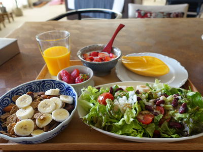 グルテンフリーのシリアルとアーモンド、チアシード、バナナの豆乳掛け。